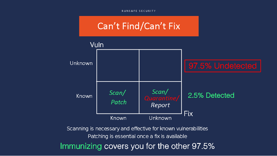 Recent research by RunSafe Security partners show that current strategies of scanning for and patching vulnerabilities in software leave a huge and highly-exploitable security gap. When measured against NIST CVEs (Common Vulnerability Enumerations from the National Vulnerability Database), the researchers found that: